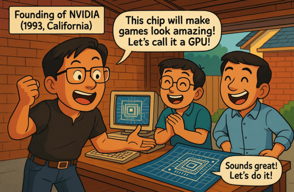 1993년, 미국 캘리포니아에서 젠슨 황(Jensen Huang)이라는 아시아계 청년이 두 친구와 함께 작은 회사를 만들었어. 그 회사가 바로 엔비디아(NVIDIA)야.