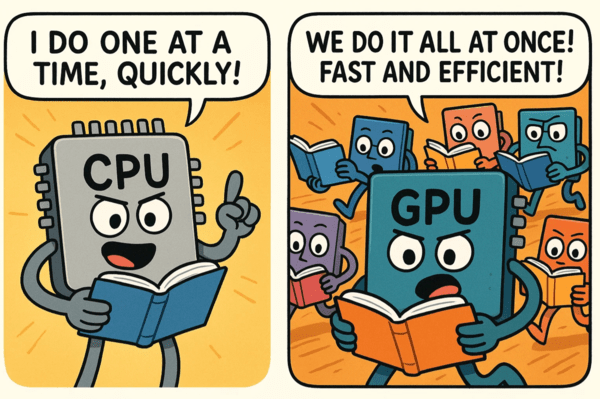 GPU(Graphics Processing Unit): 동시에 여러 개의 책을 읽을 수 있는 도서관 같은 곳이야. 게임 그래픽처럼 엄청 많은 데이터를 빠르게 계산할 때 유리해. 쉽게 말해, CPU는 혼자서 열심히 일하는 직원이라면, GPU는 여러 사람이 함께 일하는 팀 같아.