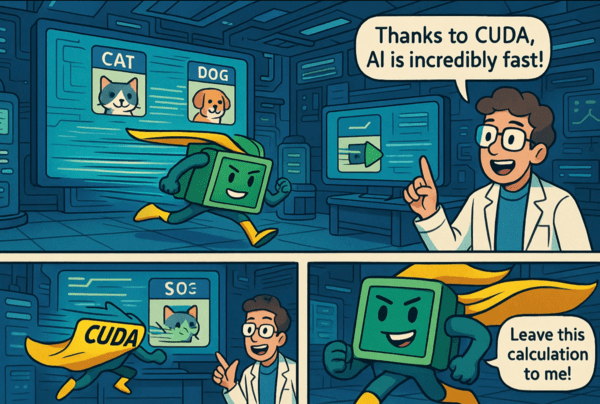 엔비디아는 GPU만 만든 게 아니야. CUDA라는 특별한 소프트웨어도 개발했어. CUDA(Compute Unified Device Architecture): GPU의 힘을 최대한으로 끌어올려서 AI, 데이터 분석 등을 더 빠르게 해줘. 예를 들어, AI가 사진 속 고양이와 강아지를 구분할 때, CPU로 계산하면 오래 걸리지만, CUDA를 사용하는 GPU로 계산하면 훨씬 빠르게 끝낼 수 있어.