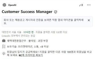 29일 업계에 따르면 오픈AI는 링크드인(LinkedIn)을 통해 ▲어카운트 디렉터(고객 총괄) ▲기술 엔지니어 ▲설루션 아키텍트 ▲고객 성공 매니저 등 총 6개 포지션의 채용 공고를 게시했다.