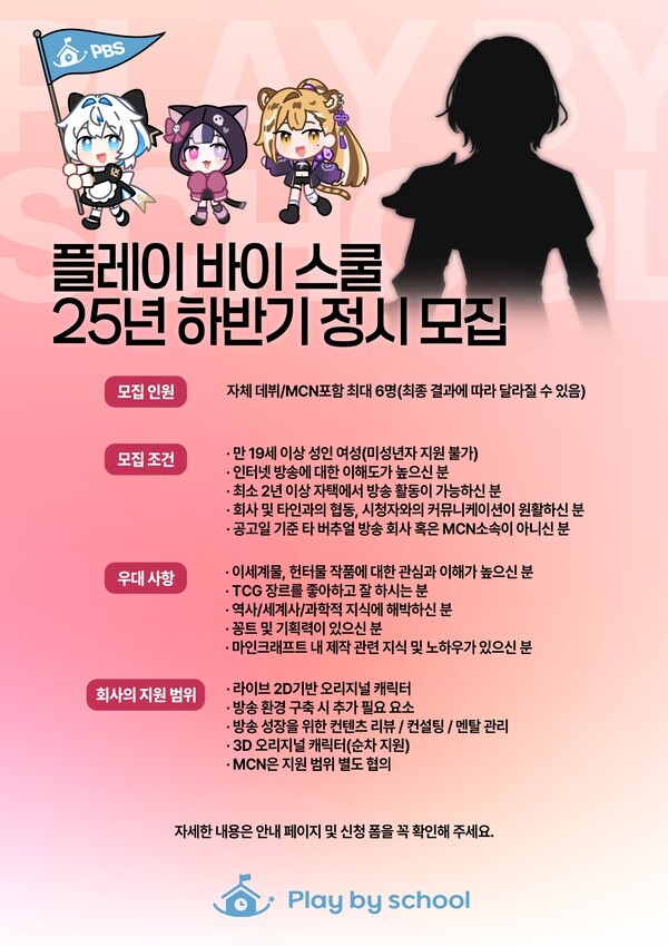 버추얼 캐릭터 및 콘텐츠를 제작하는 MCN 플레이바이스쿨이 25년 하반기 데뷔할 멤버를 모집한다고 3일 밝혔다.