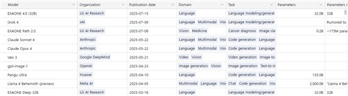 이 리스트에는 현재 전 세계 AI 모델과 논문 965개가 포함됐는데, LG AI 연구원은 지난해 등재된 엑사원 3.5를 포함해 모델 4개의 이름을 올렸다. 국내 AI 모델은 네이버 하이퍼클로바 204B 등 16개가 포함돼 있다.