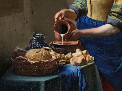 또한 여인의 손끝에서 흘러내리는 우유의 물줄기는 마치 슬로우 모션처럼 우아하고 경건하죠. 옆에 있는 빵, 도자기, 바구니까지 모든 사물이 마치 숨죽이고 있는 듯합니다.