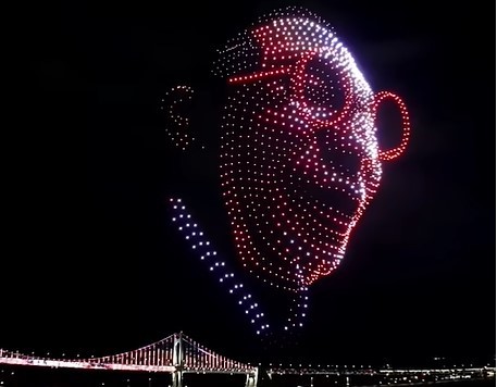 각 드론에 탑재된 고휘도 RGB LED 모듈은 프레임 단위 색상·밝기 데이터를 받아, 미소의 음영, 안경 프레임의 형광 레드, 눈빛의 하이라이트까지 표현했다. 디밍 알고리즘과 실시간 라이트맵 전송 시스템은 빛이 부드럽게 사라지고 등장하는 전환을 가능하게 했다.