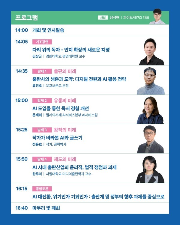 기조 강연은 ▲'다리 위의 독자 - 인지 확장의 새로운 지평'(경희대학교 경영대학원 김상균 교수)으로 시작한다. 이어 ▲'출판사의 생존과 도약: 디지털 전환과 AI 활용 전략'(교보문고 류영호 부장) ▲'AI 도입을 통한 독서 경험 개선'(밀리의 서재 AI 서비스팀 문재희 팀장) ▲'작가가 바라본 AI와 글쓰기'(SF 작가이자 공학박사인 전윤호 작가) ▲'AI시대 출판산업의 윤리적·법적 쟁점과 과제'(서일대학교 미디어출판학과 한주리 교수)순으로 이어진다. 사회는 파이브 세컨즈의 남석현 대표가 맡는다.