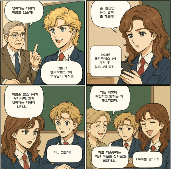 이 문제를 해결하기 위해 나온 기술이 바로 RAG(Retrieval-Augmented Generation)입니다. 기억이 아닌 ‘검색’을 먼저 하고, 그다음 대답하는 똑똑한 AI의 방식이에요.