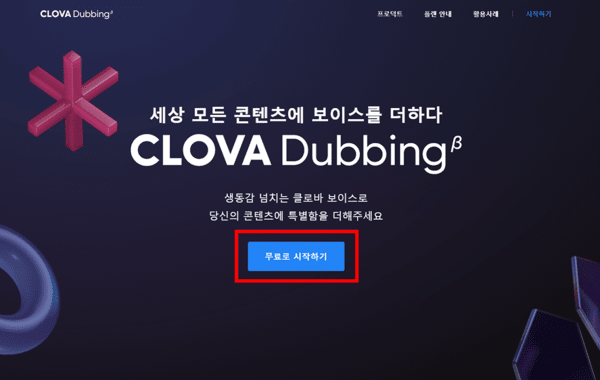우선 클로바 더빙 사이트에 접속해 '무료로 시작하기' 버튼을 누른다.