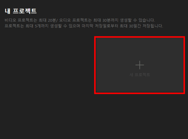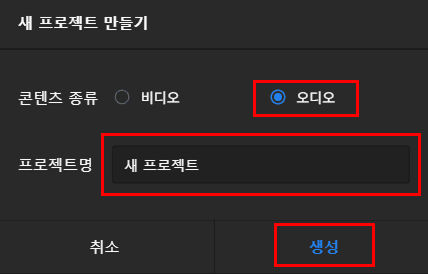 여기서 '오디오'를 선택하고 프로젝트명을 입력한 뒤 '생성하기'를 클릭한다.