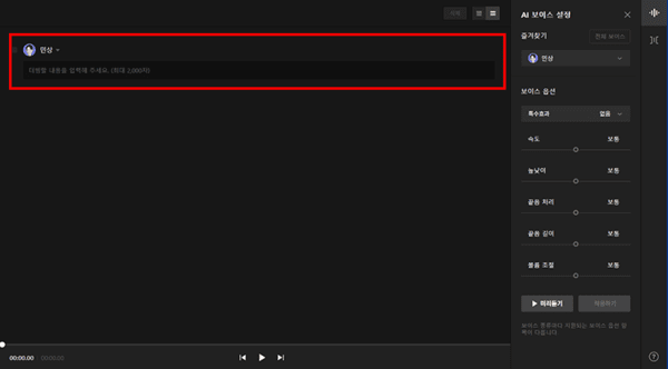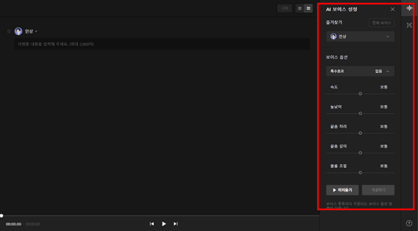 오른쪽 작업 영역에서는 다양한 목소리를 미리 들어볼 수 있다, 목소리는 여러 종류가 있어 들어본 뒤 선택이 가능하다.
