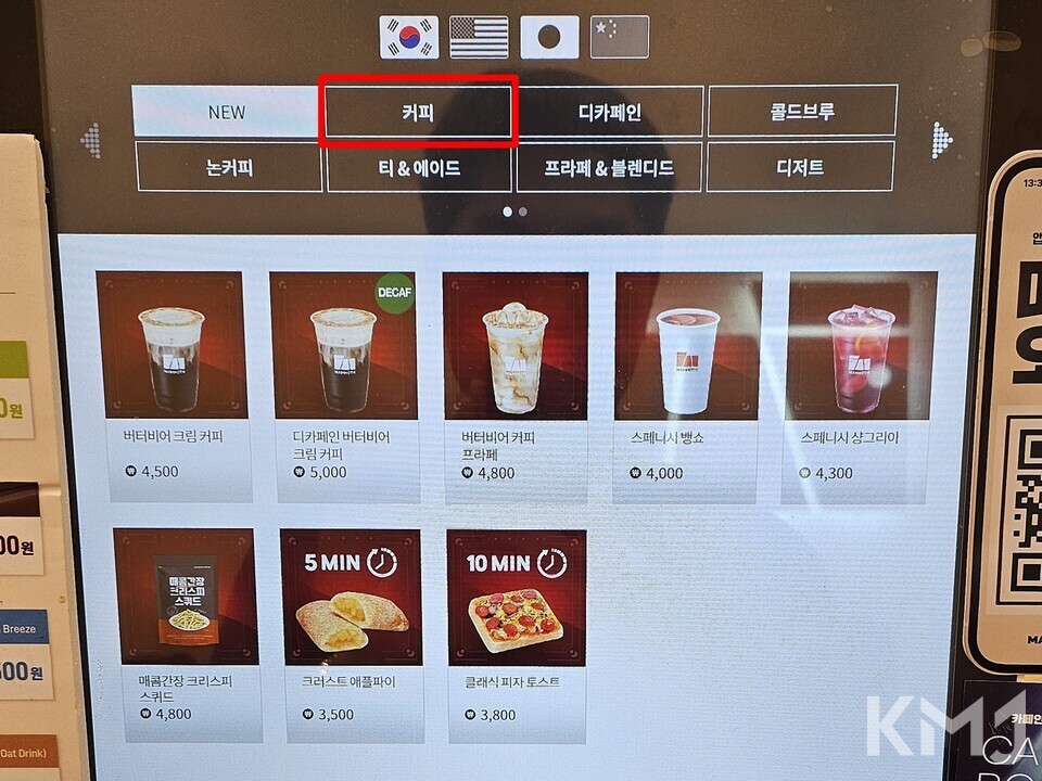 이후 키오스크 상단의 카테고리를 통해 내가 원하는 메뉴 주제인 <커피>를 누른다.