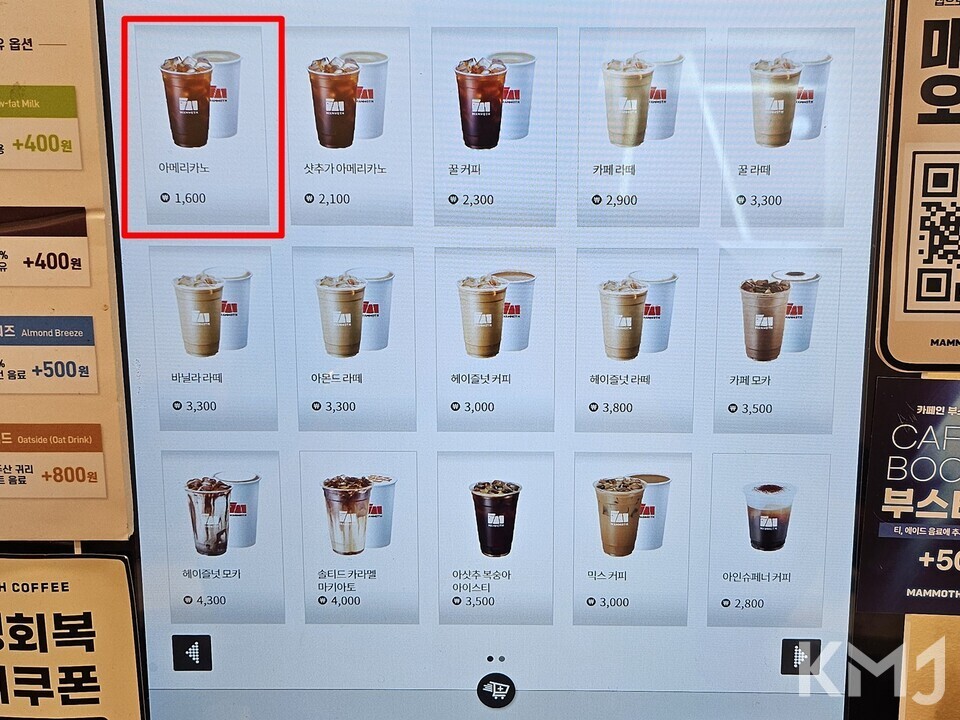 매머드 커피는 요즘 가장 흔하게 볼 수 있는 저가형 커피 프랜차이즈 중 하나다. 가격이 저렴한 만큼 대부분 매장이 키오스크로 주문을 받는다. 매머드에서 직접 아이스 아메리카노를 주문해봤다.