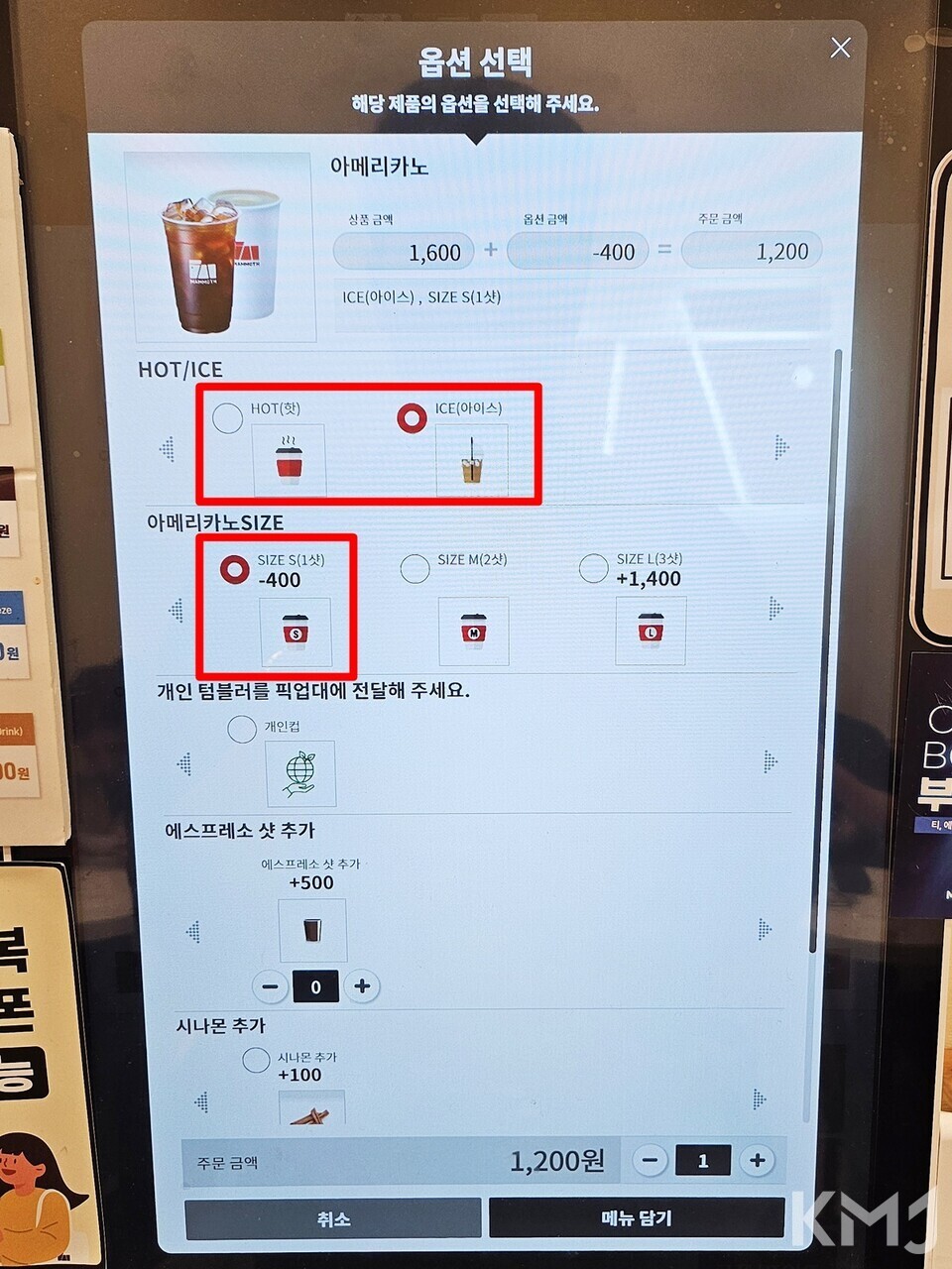 혹시 텀블러를 가져왔거나 에스프레소 샷 추가를 원한다면 아래에서 기호에 맞게 추가 설정도 가능하다.