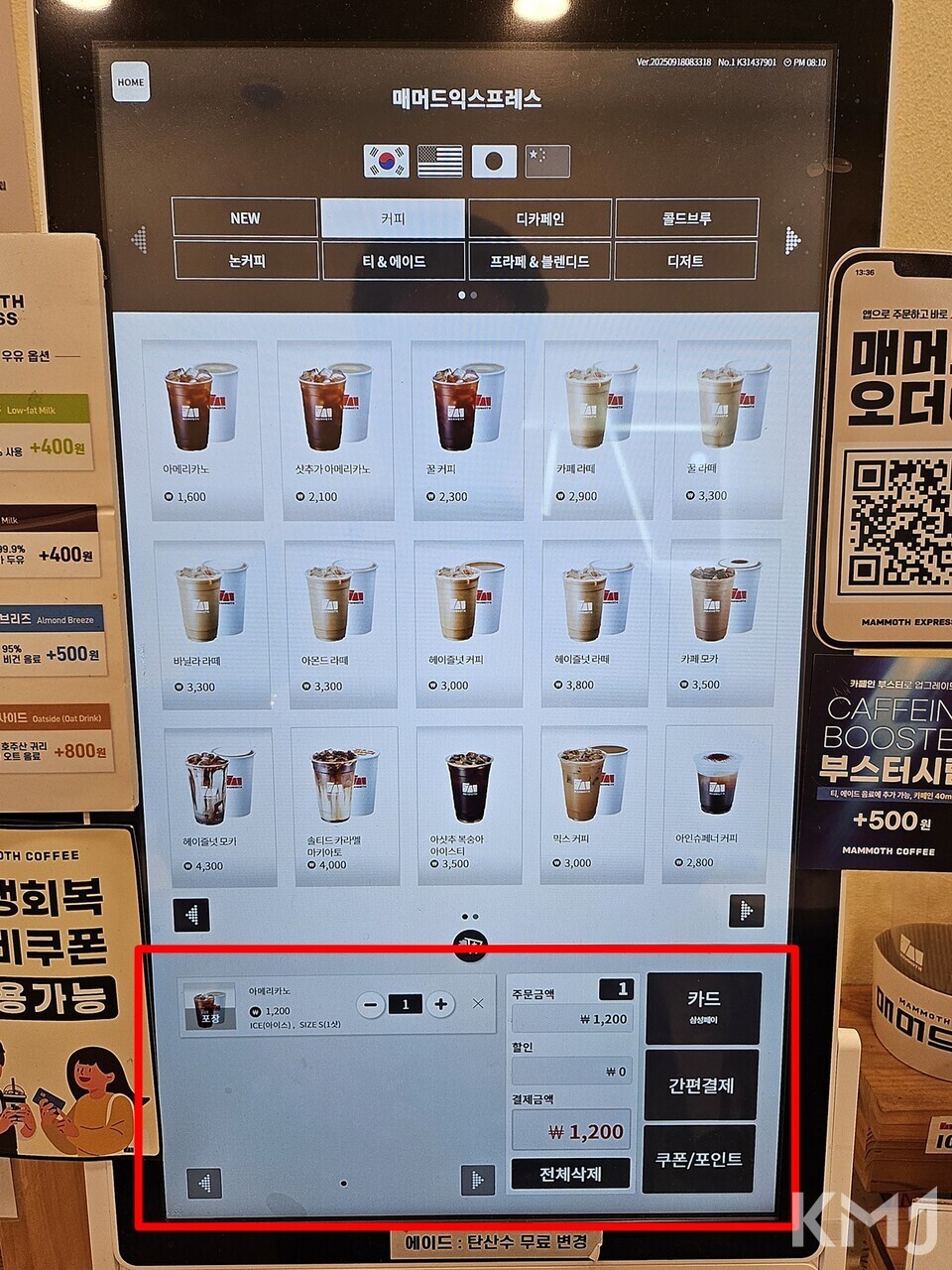 저가 커피 키오스크 중 가장 깔끔하고 직관적이다. 키오스크가 어렵다면 매머드 커피를 추천한다.