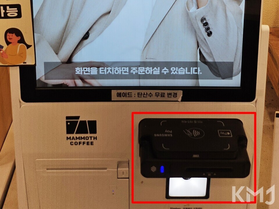 가장 익숙한 <카드> 버튼을 클릭해서 신용카드로 결제를 하자. 여기서 또 헷갈릴 수가 있다. 카드 결제는 키오스크 화면이 아니라 하단의 검은색 돌출부에서 진행해야 한다. 신용카드와 삼성페이 모두 여기에 갖다 대야 결제가 진행된다.