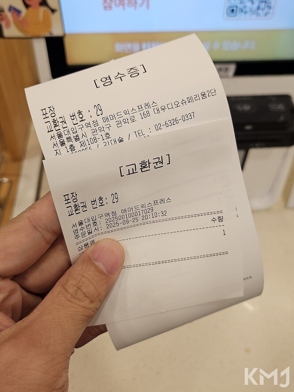 키오스크에서 나오는 영수증과 교환권 버리지 말자. 매장 직원이 주문 번호를 물어볼 수 있다.