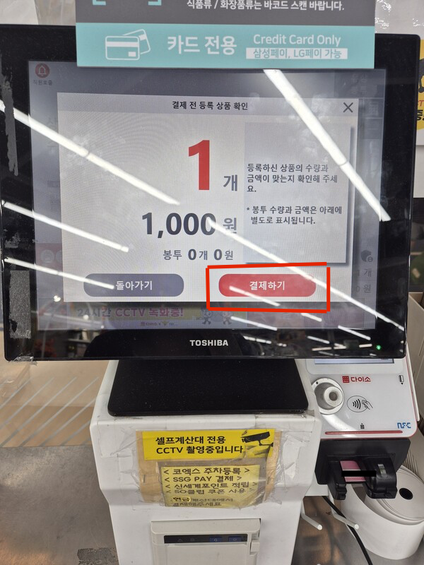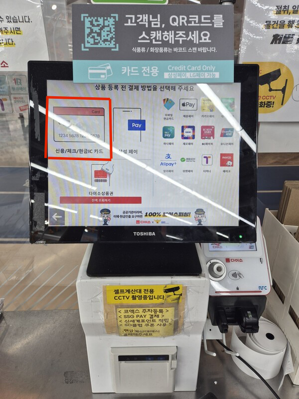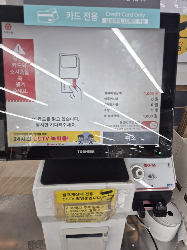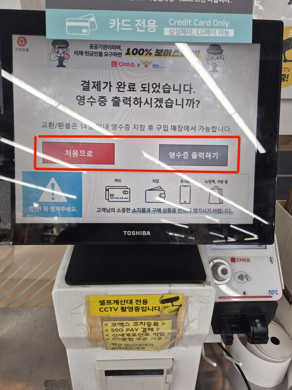 카드를 챙기면 영수증을 받을지 말지 선택할 수 있다. 교환/환불을 위해서는 영수증이 필요하기 때문에 영수증 출력을 추천한다.