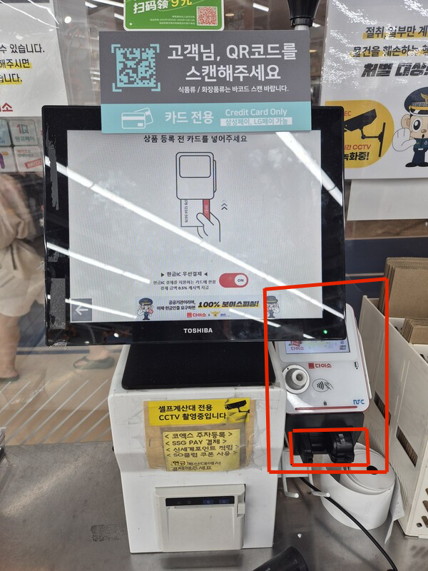 상품 등록 전 카드를 넣어달라는 안내 문구가 나온다. 기기 오른쪽 하단에 카드 단말기에 카드를 넣는다.