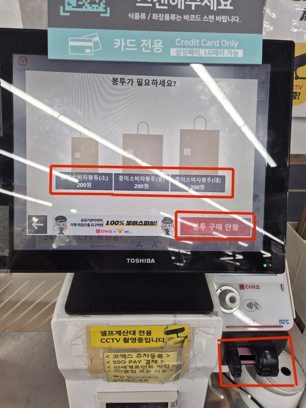 오른쪽 하단에 카드를 끝까지 밀어 넣으면 종이 봉투 구매 여부를 묻는 문구가 나온다. 크기에 따라 소, 중, 대로 나눠지며 가격은 모두 200원. 종이 봉투가 필요하다면 필요한 크기의 봉투를 선택한 뒤, 보통 계산대 앞, 옆쪽에 있으므로 필요 시 직접 가져가 사용한다.