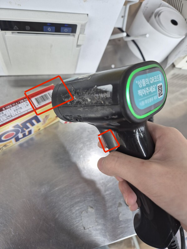 기자가 고른 상품은 QR코드 대신 바코드를 찍어야 합니다. 기기 오른편에 있는 바코드 스캐너로 바코드를 찍는다. 검지가 닿는 부분의 버튼을 누르면 바코드가 스캔!