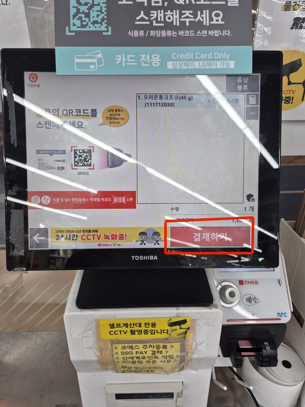 제품이 정상적으로 스캔되면 '삑'소리가 나며 화면에 제품명이 등록된다. 구매하고 싶은 상품을 모두 스캔했다면 화면 우측 하단 <결제하기> 버튼을 터치.