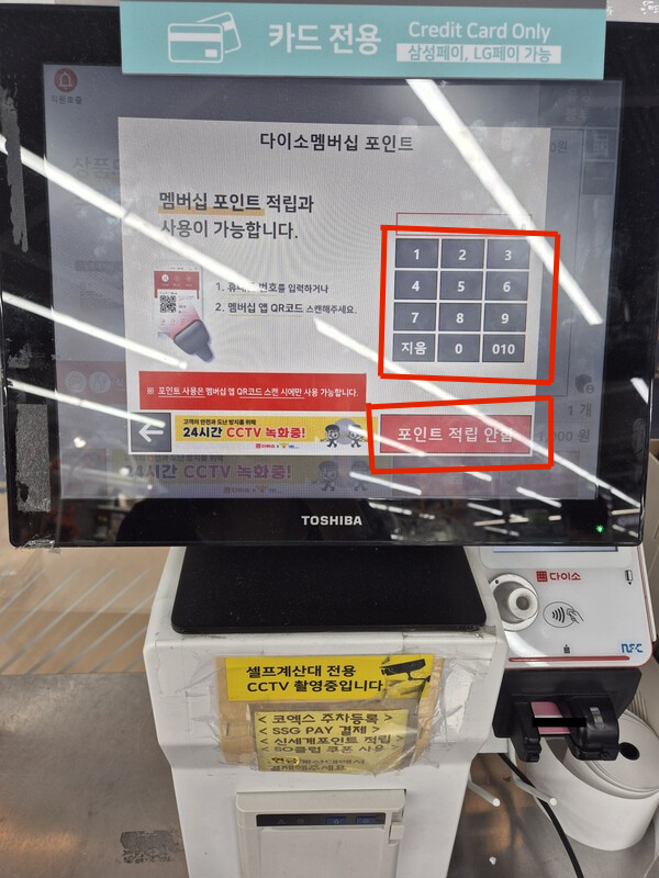 다음으로 다이소 멤버십 포인트 적립 여부에 대한 화면이 나온다. 포인트를 적립한다면 화면의 키패드를 눌러 휴대폰 번호를 입력. 적립 하지 않는다면 화면 우측 하단 <포인트 적립 안함> 버튼을 누른다.