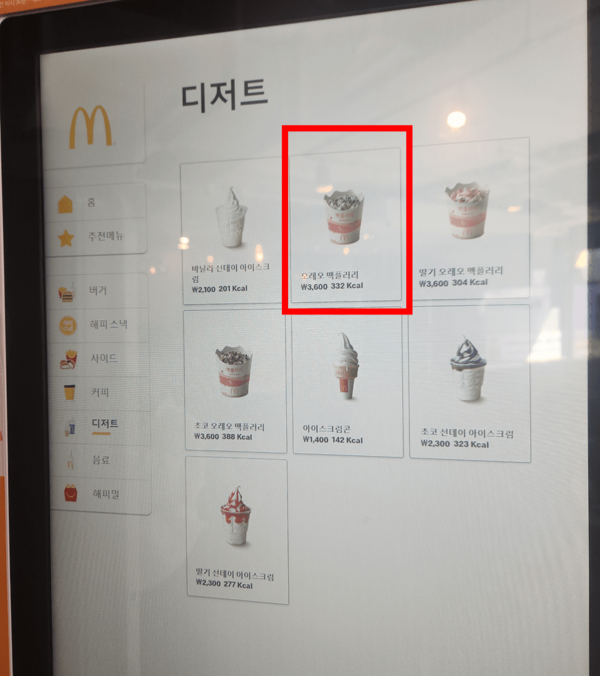 디저트 메뉴판이 나오면 가장 기본 메뉴인 '오레오 맥플러리'를 선택한다.