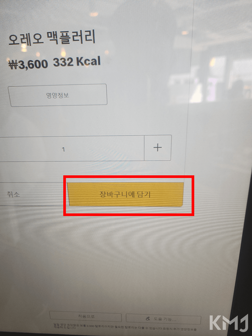 원하는 메뉴를 장바구니에 담으면 다시 처음 화면으로 돌아간다. 많은 어르신들이 당황하고 주문을 포기하는 구간이다.