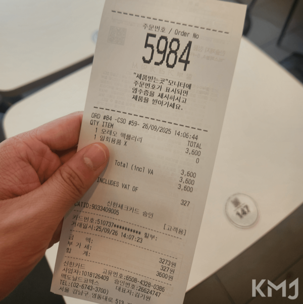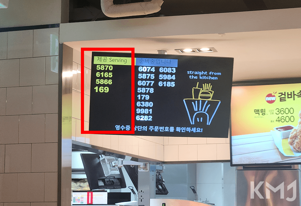 결제가 끝나면 주문번호가 찍힌 영수증이 나온다. 매장 내 모니터를 확인하자. 좌측 '제공'에 주문번호를 보고 메뉴를 받아가자.