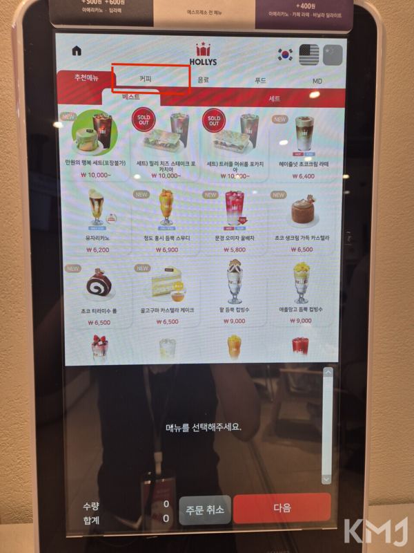 가장 처음 보이는 화면은 추천메뉴다. 매장의 인기 메뉴나 신상품이 이곳에 뜬다. 하지만 오늘 우리가 주문할 음료는 아이스 아메리카노이기 때문에 화면 상단의 <커피>버튼을 누른다.