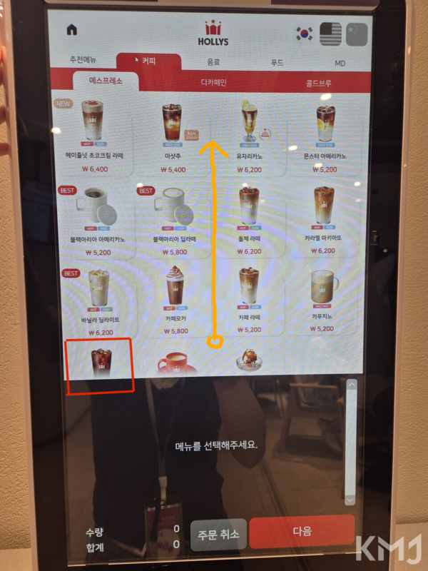 아메리카노는 화면 아래쪽에 숨어있다! 이미지의 주황색 화살표를 따라 아래에서 위로 화면을 쓸어 올린다.