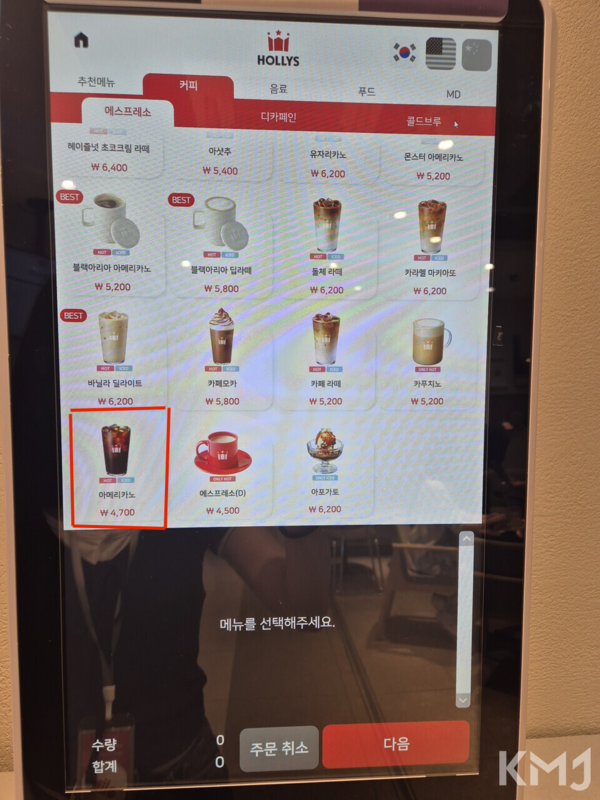 그러면 화면이 위로 올라가며 아래쪽에 있던 메뉴들이 보인다. 아메리카노를 눌러 음료를 선택한다.