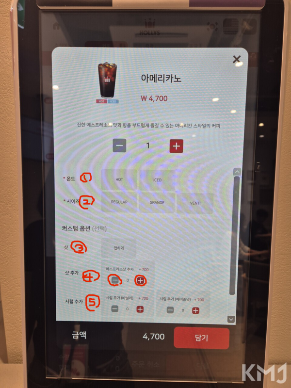 이제 '어떤' 아메리카노를 먹을지 선택할 수 있는 화면이 나온다. 조금 복잡해 보이지만 글자를 천천히 읽으며 선택하면 된다. 1번과 2번은 주문을 하기 위해 필수로 선택해야 하고 3~5번은 부가적인 옵션이기 때문에 선택하지 않아도 된다.