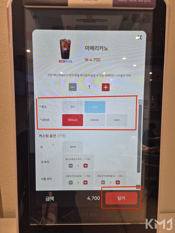 기자는 차가운 'ICED', 가장 기본 사이즈인 REGULAR를 골랐고 아래쪽은 추가하지 않았다. 선택을 마쳤다면 우측 하단 <담기>를 터치한다.
