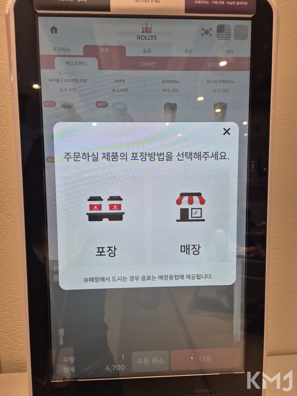 다음으로 제품의 포장방법을 묻는 화면이 나온다. 왼쪽의 '포장'을 선택할 경우 일회용 플라스틱, 종이 컵에 담긴 음료가 나옵니다. 일회용품 컵은 매장 안에서 사용할 수 없기 때문에 음료를 들고 밖으로 나갈 때 선택한다.