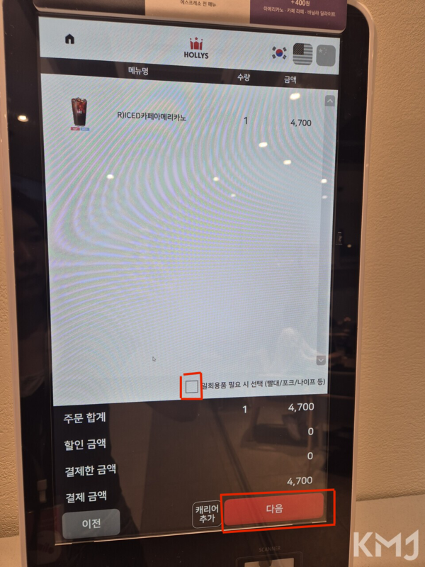 이 화면에서는 빨대, 포크, 나이프 등 일회용품이 필요할 경우 네모칸을 터치한다. 필요하지 않기 때문에 선택하지 않고 화면 우측 하단 <다음>을 눌렀다.