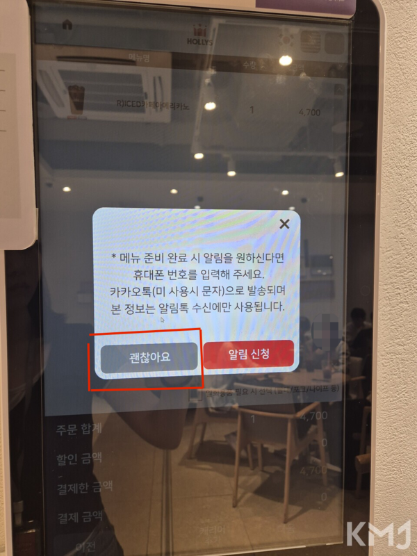 결제가 끝나면, 메뉴 준비 완료시 어떻게 알림을 받을지 묻는 문구가 나온다. 휴대폰 알림 신청을 받고 싶지 않으니 <괜찮아요>를 누른다.