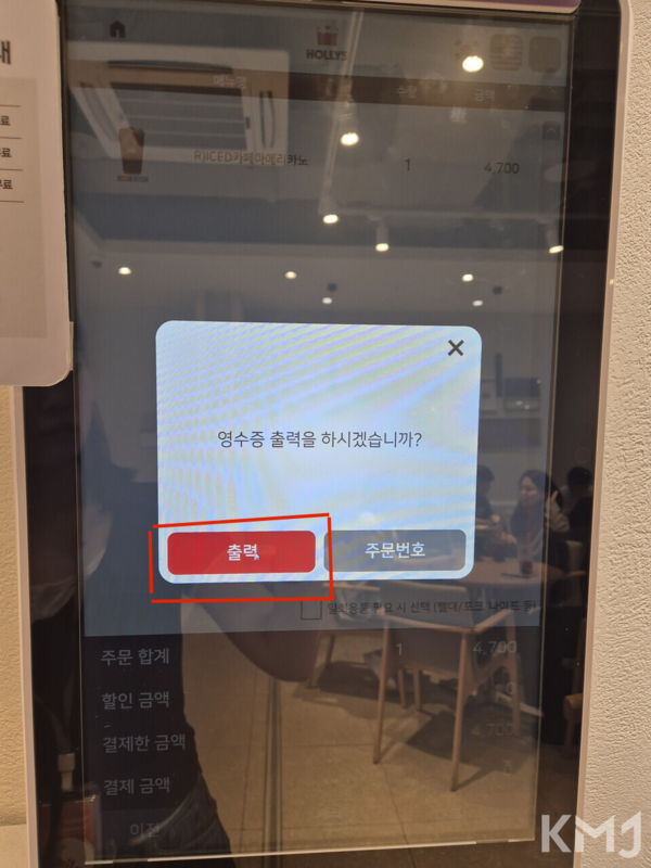 메뉴명과 가격이 적힌 영수증이 필요하다면 <출력>을 누른다. <주문번호>를 누르면 주문한 메뉴와 가격이 적히지 않고 주문번호만 적힌 종이가 출력된다.