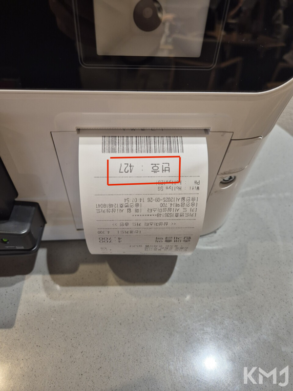 키오스크 아래쪽에서 영수증이 나왔다. 준비된 커피를 가져가기 위해서는 주문번호가 필요하기 때문에 이 종이를 챙긴다.
