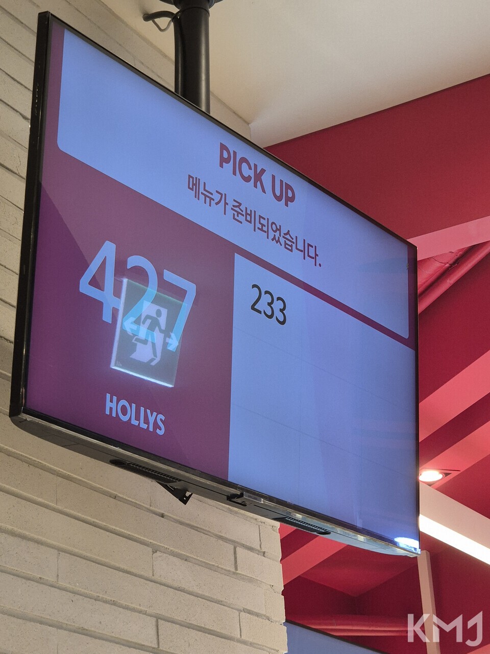 이제 잠시 기다리다가 커피가 준비되면 직원이 직접 번호를 불러주거나, 매장에 있는 모니터에 주문번호가 뜬다. 주문번호인 427번이 화면에 떴으니 제품을 가지러 간다.