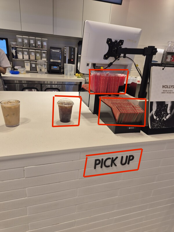 이제 매장에 PICK UP(픽업)이라 적힌 곳에서 커피를 수령하면 된다. 이곳에 배치된 빨대와 컵홀더는 자유롭게 가져가 사용한다.