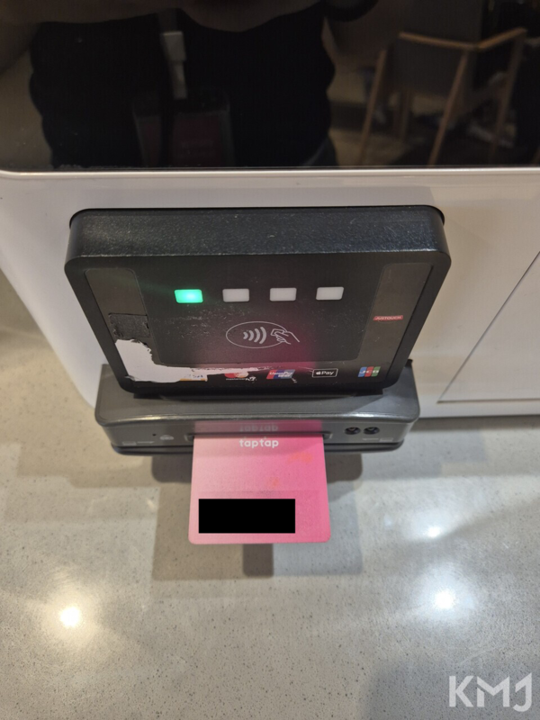 카드를 넣어 결제를 진행해 달라는 화면이 나오면, 키오스크 하단의 카드 단말기에 카드를 끝까지 집어넣어 결제가 완료될 때까지 기다린다.