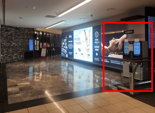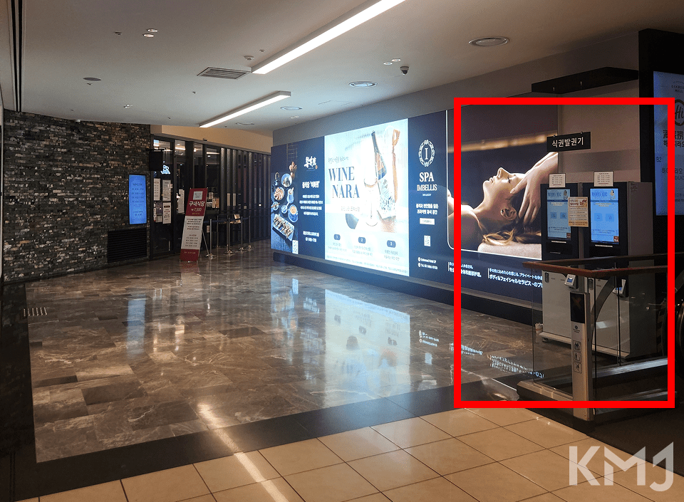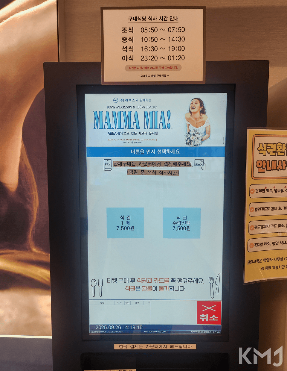 오크우드 구내식당의 키오스크는 식당 입구 근처 에스컬레이터 옆에 있다. 천장에 '식권발권기' 안내판을 확인한다.