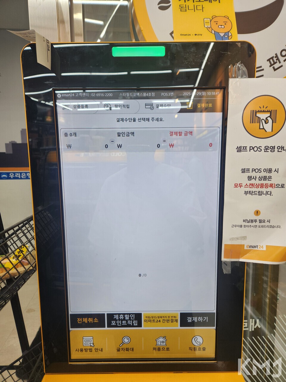 대부분 편의점이 그러하듯 이마트24 무인 매장에서 사용하는 키오스크는 고객이 상품의 바코드를 직접 찍는 방식이다. 복잡한 과정 없이 누구나 쉽게 따라 할 수 있도록 단계별로 정리했다.