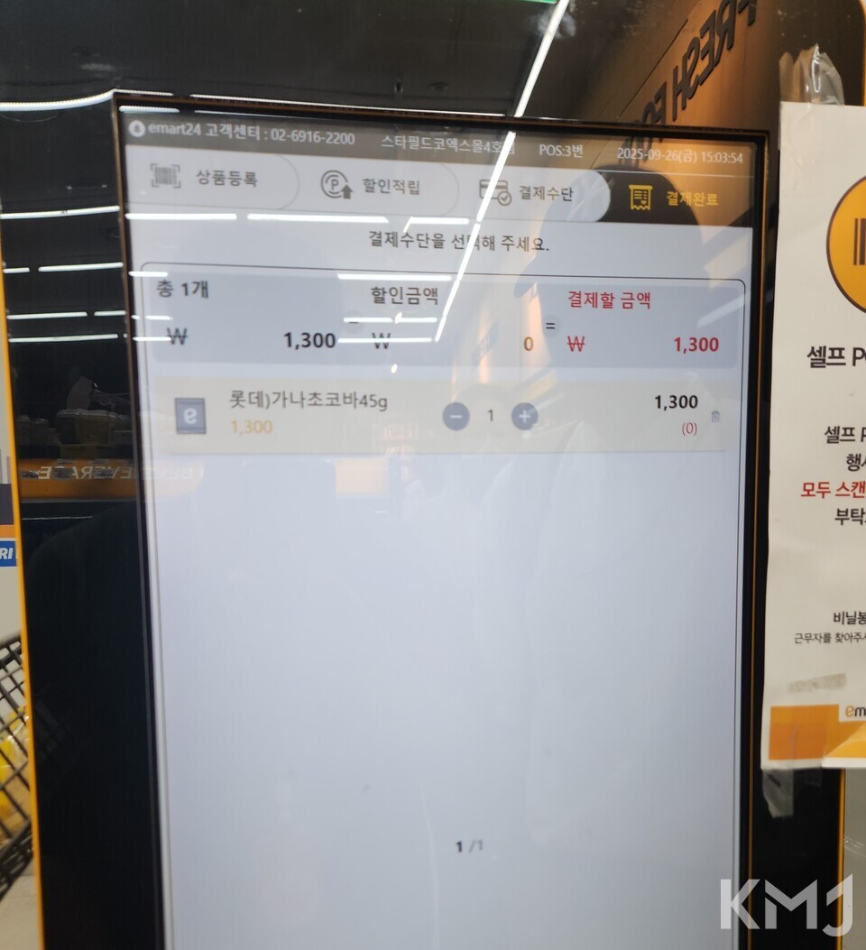 상품이 스캔된 것을 볼 수 있다. 수량과 항목을 확인한다. 기자는 초코바 하나를 구매한다.