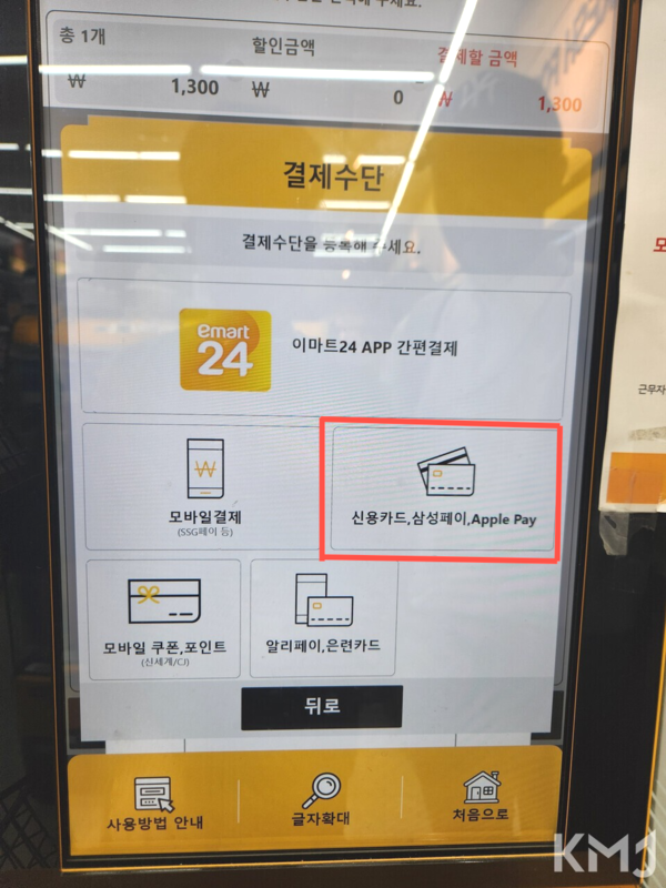 이제 결제 방식을 고른다. 키오스크는 현금을 받지 않는다. 신용카드 버튼을 눌러 카드로 결제하자.