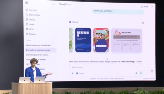 사용자는 “Canva로 포스터 만들어줘”, “Zillow에서 매물 찾아줘”라고 말하기만 하면 된다. 별도의 설치나 로그인 없이, 외부 앱의 기능이 챗GPT 대화창 안에서 바로 실행된다.