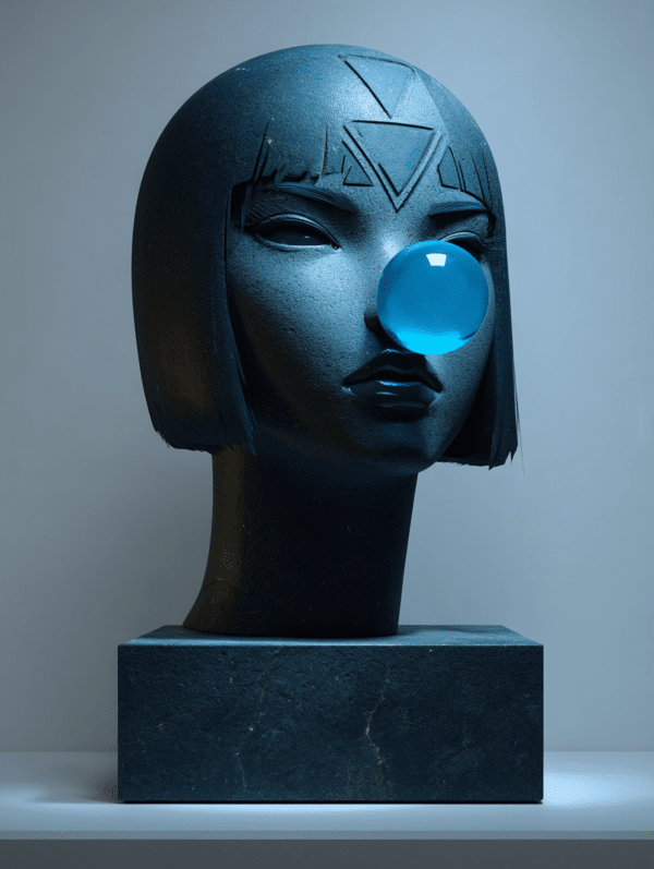 시대 구분이 없는 얼굴을 고대의 유물과 미래적인 요소를 결합하여 지속성의 미학을 보여줍니다. 석상 같은 질감은 오랜 시간의 흐름을 암시하면서도, 빛나는 유리 코의 이질감이 시대를 초월하여 존재했음을 강조합니다. 이는 감정의 형태적 패턴이 과거, 현재, 미래를 아우르는 보편성을 가진다는 의미를 전달합니다.