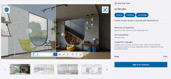 메타의 XR 기술뿐만 아니라 3D 그래픽스 분야에서 스케치업 또한 진보된 시스템을 만들어 나가고 있다. 2D 도면을 3D 렌더링으로 바꿀 때, 지금까지는 엄청난 시간을 들여 하나하나 모델링해야 했다면 이제 AI가 순간에 뚝딱 도면을 기반으로 3D 렌더링을 한다.